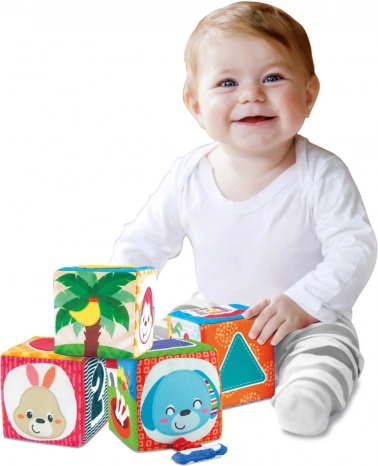 Odkryj zestaw 4 kolorowych, tekstylnych klocków dla niemowląt i maluchów, które rozwijają percepcję sensoryczną, motorykę małą oraz naukę liczb i kształtów. Każdy klocek ma różne faktury, bezpieczne lusterko oraz ilustracje zwierzątek, liczb i kształtów. Klocki można układać w stabilną piramidę i tworzyć z nich serię obrazków dla zabawnej nauki.