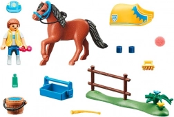 W zestawie znajduje się figurka dziecka, kucyk z derką i uzdą, kapelusz jeździecki, wiaderko, torba, szczotka i inne dodatki. Elementy są łatwe do mycia, trwałe i bezpieczne dla dzieci.
