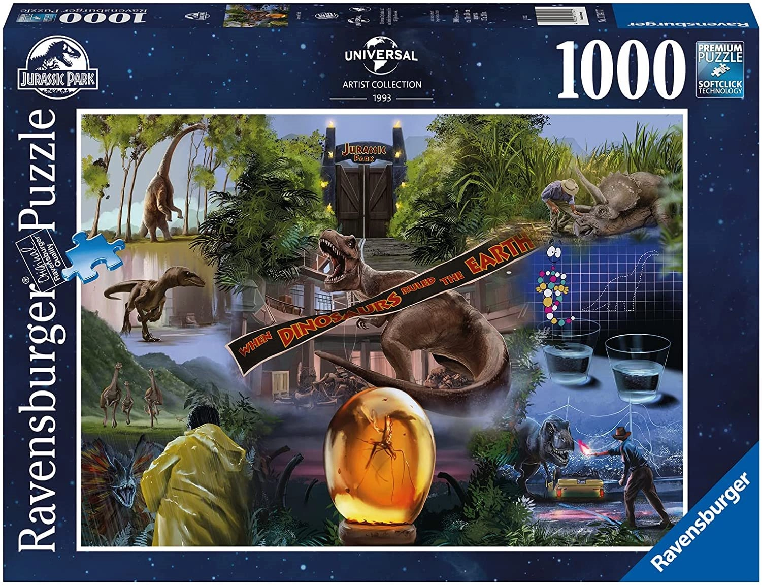 Seria puzzli Ravensburger 1000 elementów oferuje wyjątkowe i interesujące wzory do układania, w tym przypadku układankę z motywem z filmu Park Jurajski.