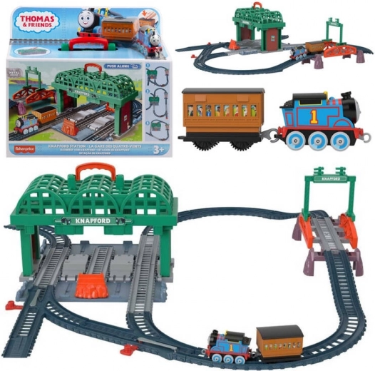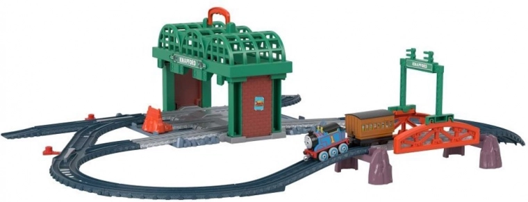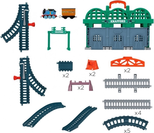 - Stacja Knapford z panelem do przechowywania i uchwytem, elementy torów, most, oznaczenia wiaduktu, lokomotywa Tomek (push‑along), wagonik pasażerski z pasażerami