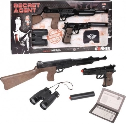- metalowy karabin, pistolet na 8 naboi z magazynkiem, lornetka, legitymacja tajnego agenta