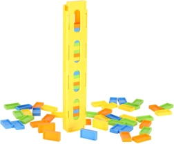 Zestaw zawiera: kolorową lokomotywę, podajnik kostek, 80 szt. domino oraz plastikowy kaktus jako przeszkodę.