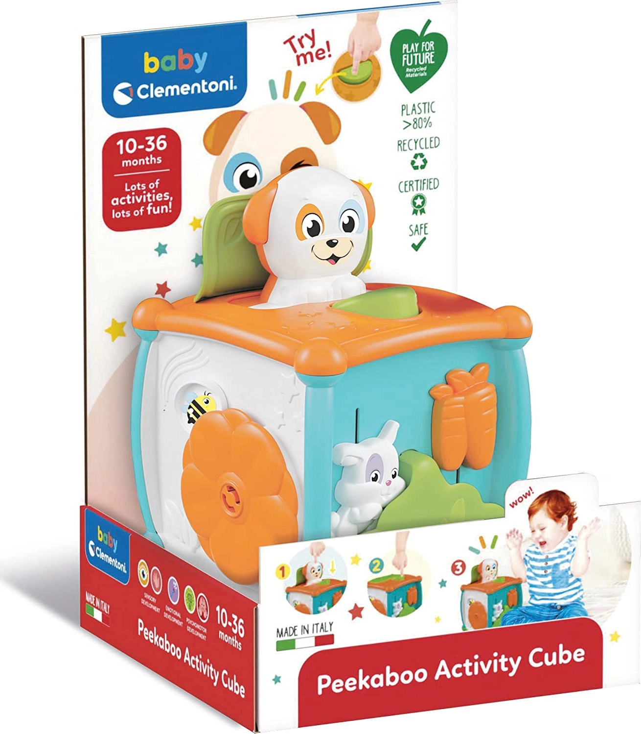 Produkt jest częścią ekologicznego programu Clementoni Play for Future, który uczy dzieci znaczenia zrównoważonego rozwoju. Wymiary kostki to 14 x 14 x 14 cm. Kolorystyka może się różnić.