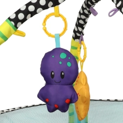 - Zabawki i piłeczki: Mata zawiera kolorowe i miękkie zabawki, takie jak rybka, ośmiornica, gwiazdka oraz pudełeczko z lusterkiem. Dodatkowo 30 plastikowych piłeczek w żywych kolorach stymuluje zmysły dziecka.