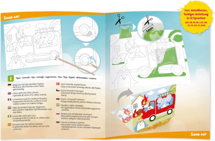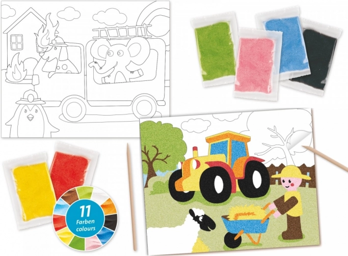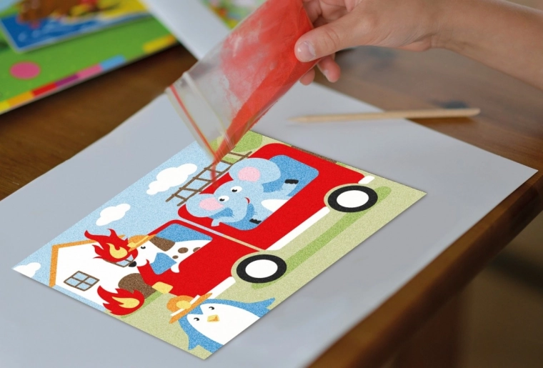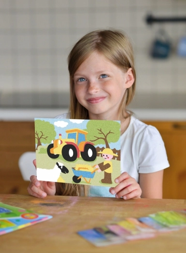 Ten kreatywny zestaw z piasku to świetny wybór dla małych twórców od 6 lat. Wystarczy stopniowo odkrywać poszczególne części motywu i posypywać je kolorowym piaskiem – barwy przyczepią się do samoprzylepnej powierzchni, tworząc wyrazisty, czysty obraz. Zestaw oferuje dwa ulubione motywy: traktor i wóz strażacki.