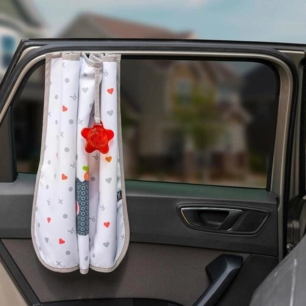 Montaż jest bardzo prosty dzięki czterem mocnym magnesom, które szybko i bezpiecznie mocują osłonę do ramy drzwi bez użycia przyssawek czy haczyków. Gdy osłona nie jest potrzebna, można ją łatwo złożyć i związać za pomocą wszytych pasków, co ułatwia przechowywanie. Specjalna gwiazdka z błyszczącym efektem dodatkowo zapewnia rozrywkę małym pasażerom, dzięki czemu podróż mija szybciej.