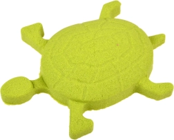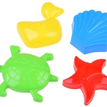 Cztery plastikowe foremki w kształcie kaczuszki, muszli, żółwia i gwiazdy ułatwiają zabawę i formowanie piasku dynamicznego.