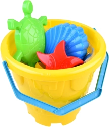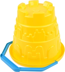 Plastikowe wiaderko z niebieską rączką i foremkami w środku umożliwia łatwe przenoszenie na plażę lub do ogrodu.