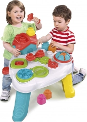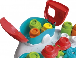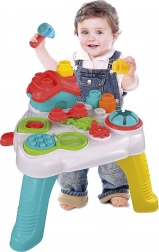 Stolik oferuje szeroki zakres aktywności do rozwijania motorycznych umiejętności dzieci, takich jak zębatki, katapult do klocków i pękające bańki.