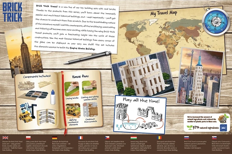 Odkryj świat budowania z serią BRICK TRICK Travel i stwórz własny model jednej z najsłynniejszych budowli świata – EMPIRE STATE BUILDING. Cegiełka po cegiełce, z docinaniem i klejeniem deseczek, krok po kroku dojdziesz do szczegółowej i stabilnej konstrukcji. Na koniec wykończysz ją dołączonymi dekoracjami, aby uzyskać autentyczny wygląd.
