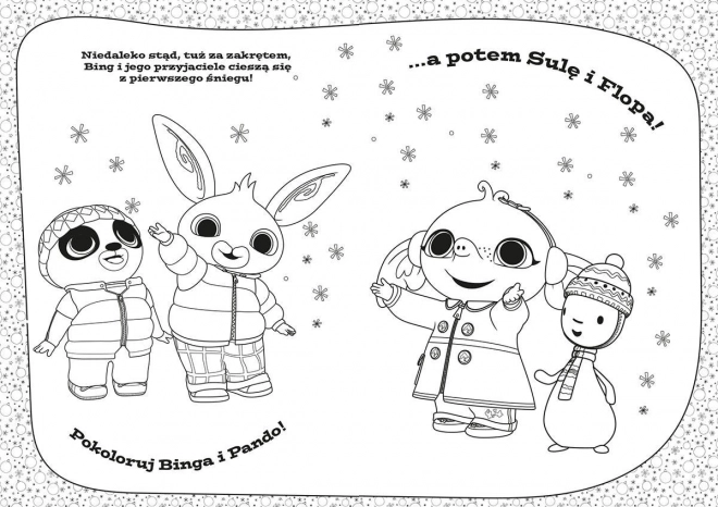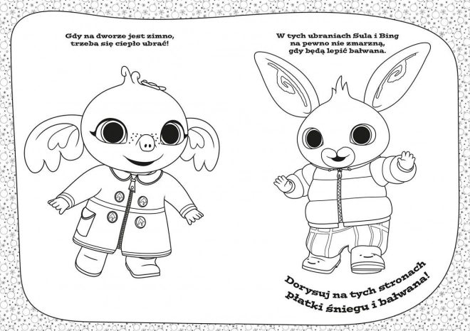 Zabawa kredkami to pewny sposób na świetną rozrywkę, zwłaszcza gdy na dworze jest zimno i pada śnieg! Weź swoje ulubione przybory do rysowania i koloruj, przyklejaj naklejki oraz rozwiązuj proste zadania zawarte w tej zimowej kolorowance. Towarzystwo Binga, Flopa i innych bohaterów z uroczej króliczej serii będzie dodatkową atrakcją! Na 24 stronach tej książki czekają na ciebie nie tylko świąteczne i okolicznościowe motywy, ale także wszystko, co wiąże się z zimą – jest śnieg, bałwan, przyjazne postacie ubrane w ciepłe kurtki i mnóstwo zabawy. Obrazki do kolorowania i uzupełniania przeplatane są aktywnościami, które maluch może z powodzeniem wykonać samodzielnie. Dzięki temu zabawa jest jeszcze ciekawsza!