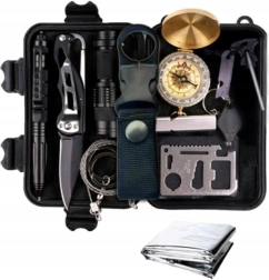 W zestawie znajduje się solidna karta przetrwania ze stali nierdzewnej, składany nóż, dwie lampki LED (taktyczna i sygnalizacyjna), zamykany kompas, awaryjny koc termiczny 160 × 210 cm, piła strunowa, krzesiwo magnezowe ze skrobakiem, gwizdek ratunkowy oraz klips do butelki. To wszystko w solidnym, kompaktowym etui, które chroni zawartość i utrzymuje ją w porządku.