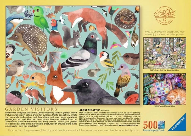 Puzzle 500 elementów pod nazwą Mieszkańcy ogrodów oferują unikalne i subtelne wzory, które łatwo się układa i które tworzą piękny obraz. Idealne do treningu umysłu i relaksu.