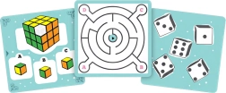 Kolorowe karty z zadaniami dotyczącymi barw, wzorów, labiryntów czy liczenia rozwijają umiejętności poznawcze i wspierają rozwiązywanie problemów w atrakcyjnej formie.