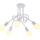 Stylowy żyrandol sufitowy z 5 punktami świetlnymi i gwintem E27 wniesie do Twojego wnętrza nowoczesny loftowy charakter oraz dużo światła. Metalowa konstrukcja jest wytrzymała, łatwa w montażu i kompatybilna ze standardowymi oraz dekoracyjnymi żarówkami. Możliwość podłączenia do podwójnego włącznika pozwala wygodnie regulować intensywność oświetlenia.