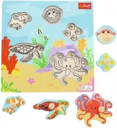 Odkryj urok oceanu z drewnianymi puzzlami, które łączą wysoką jakość wykonania i wartość edukacyjną. Każdy element ma drewniany uchwyt ułatwiający chwytanie, a podkład z czarno-białą sylwetą podpowiada, gdzie dany element pasuje. Dzięki solidnemu drewnu puzzle są trwałe i idealne dla małych dziecięcych rączek.