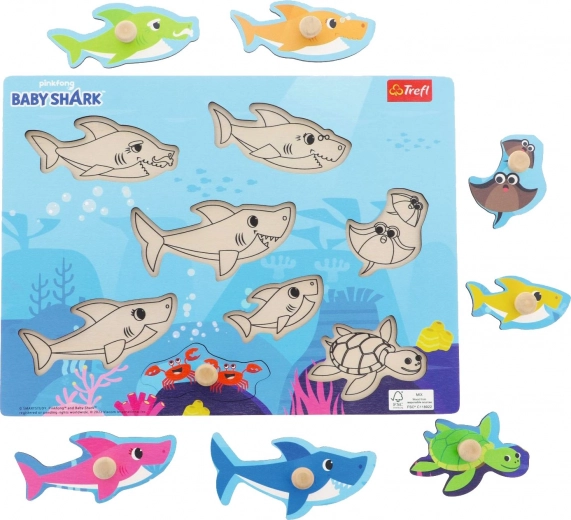 Drewniane puzzle BABY SHARK z 8 elementami i drewnianymi uchwytami. Solidna podkładka z podpowiedzią, idealne od 18 miesięcy. Wspierają motorykę i naukę przez zabawę.