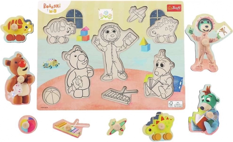 Drewniana układanka z motywem BOBASKI I MIŚ została zaprojektowana dla najmłodszych dzieci. Solidne elementy z dużymi drewnianymi gałkami łatwo trzymają się nawet w małych rączkach. Podkładka z wyfrezowanymi kształtami oraz zgodną czarno-białą grafiką pod elementami ułatwia dziecku prawidłowe dopasowanie kształtów i wspiera jego samodzielność podczas zabawy.