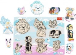 Odkryj drewniane puzzle Lodowy zamek z 8 wyjmowanymi elementami z gałkami, idealnymi dla małych dziecięcych rączek. Kolorowa grafika i podkład z frezowanymi kształtami z czarno-białymi konturami pomagają dzieciom łatwo znaleźć właściwe miejsce. Ta zabawka rozwija małą motorykę, koordynację oko–ręka oraz naukę kształtów – świetna już od 18 miesięcy.