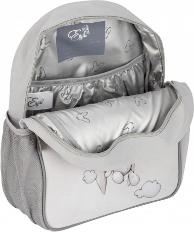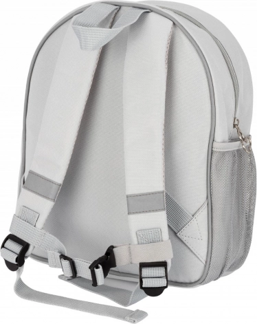 Główna komora z szerokim zamkiem błyskawicznym umożliwia szybkie pakowanie i rozpakowywanie. Nie brakuje wewnętrznej kieszeni na przekąskę lub pojemnik, metryczki na imię oraz dwóch kieszeni bocznych (jedna z siateczki) na butelkę z wodą. Trwały, wodoodporny materiał z poliestru chroni zawartość plecaka podczas codziennego użytkowania.