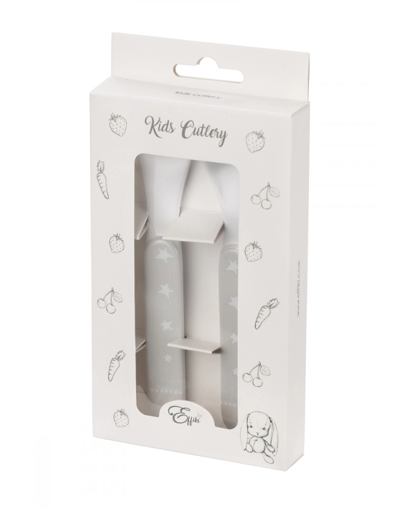 Widelec i łyżeczka z szarymi rączkami ozdobionymi gwiazdkami zachwycają wesołym wyglądem i prostym wzornictwem.