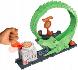 Tematyczny zestaw Hot Wheels z krokodylą pętlą dostarcza akcji pełnej emocji – wystrzel autko z pizzerii, przejedź przez paszczę krokodyla i pokonaj pionową pętlę, aż do tarczy końcowej. Dzieci pokochają nieskończone kreatywne historie i starcia z potworem, które wspierają wyobraźnię oraz zręczność.