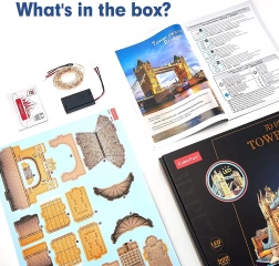 Odkryj piękno londyńskiego Tower Bridge z zestawem puzzli 3D od CubicFun. Ten model z serii Architecture Model-LED Lighting wykonany jest ze specjalnego materiału – pianki pokrytej laminowanym, zadrukowanym papierem o grubości ok. 3 mm. Zalety tego modelu: