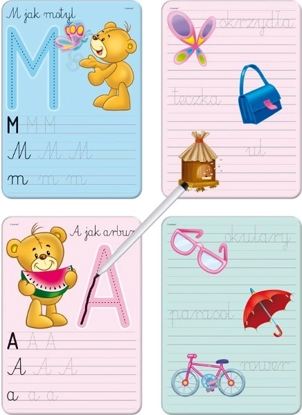 Zestaw „Piszę i ścieram – litery” motywuje młodych uczniów do treningu pisania w bezpiecznej i radosnej atmosferze. Dzieci mogą pisać nawet krzywo lub poza liniami – wystarczy zetrzeć i spróbować ponownie. Wesoły przewodnik, miś Krzyś, dodaje nauce radości i odwagi.