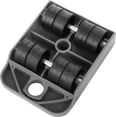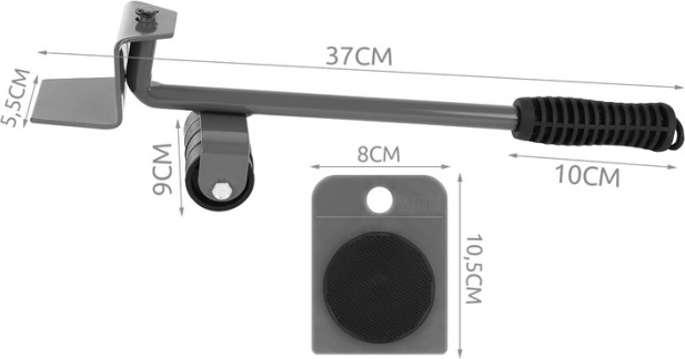 Ten 5‑częściowy zestaw łączy mocną stalową dźwignię z gumowym uchwytem oraz cztery podstawki transportowe z kółkami, które zapewniają płynne przemieszczanie szaf, łóżek czy komód. Górna powierzchnia podstawek ma antypoślizgową, obracaną o 360° płytę ułatwiającą manewrowanie.