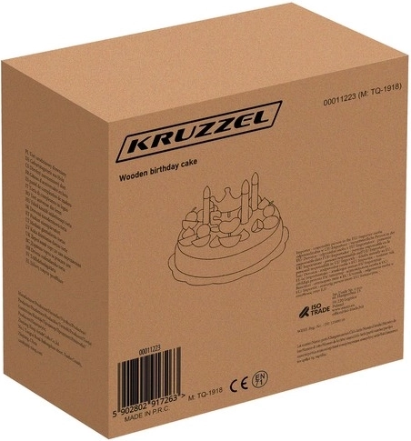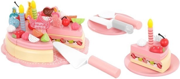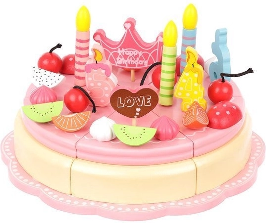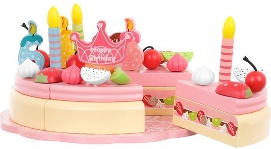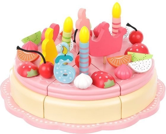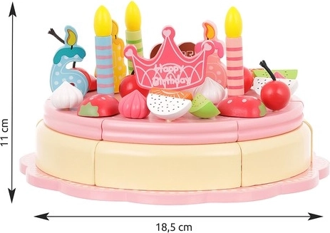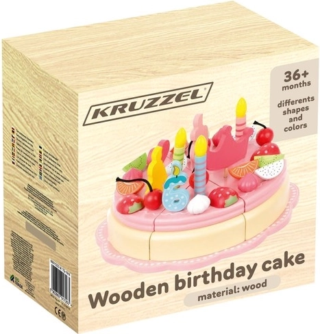 Ten tort jest wykonany z wysokiej jakości drewna, które jest bezpieczne dla dzieci i oferuje ponadczasowe piękno oraz trwałość. Części tortu są połączone magnesami, co pozwala dzieciom „kroić” tort i serwować go na dołączonych talerzach i przy pomocy sztućców.