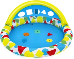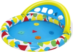Nadmuchiwane miękkie krawędzie, płytka powierzchnia wodna i daszek zapewniają wygodę oraz większe bezpieczeństwo podczas zabawy na zewnątrz.