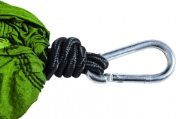 Hamak Santiago wyposażony jest w masywne metalowe haki i mocne plecione liny z wewnętrznym drutem, co zapewnia niezawodność i wysoką nośność do 150 kg.