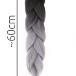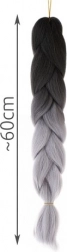 Wysokotemperaturowe włókno jest odporne na promieniowanie UV i wysokie temperatury, co pozwala na stylizację suszarką, prostownicą czy lokówką tak jak przy włosach naturalnych. Specyfikacja produktu obejmuje czarno-szary kolor, syntetyczny materiał oraz długość około 60 cm.
