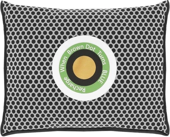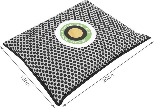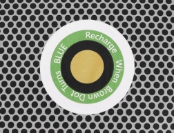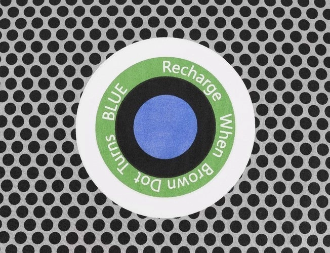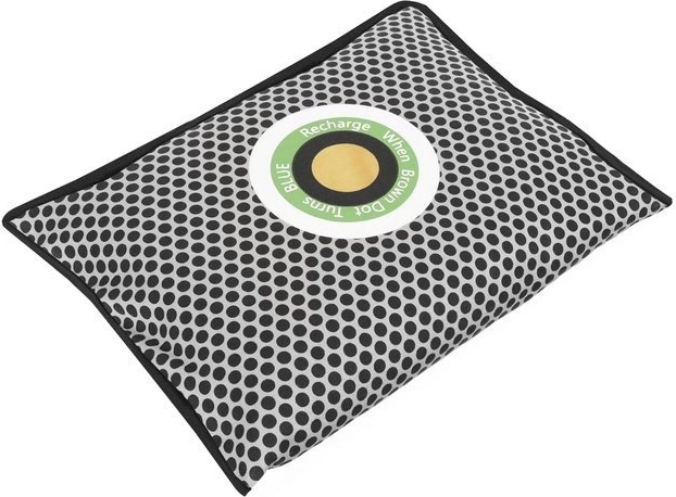 Pośrodku znajduje się kolorowy wskaźnik, który wyraźnie pokazuje stopień nasycenia. Pomarańczowy oznacza, że pochłaniacz jest suchy i gotowy do użycia; gdy zmieni się na niebieski, wystarczy go „naładować” przez wysuszenie (np. w kuchence mikrofalowej). Wilgoć odparuje, a produkt znów będzie gotowy do wielokrotnego użycia – z żywotnością do 3 lat.