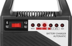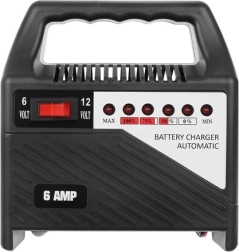 Kompaktowa automatyczna ładowarka do akumulatorów 6 V i 12 V z prądem ładowania do 6 A. Idealna do akumulatorów samochodowych, motocyklowych i ołowiowych 20–65 Ah. Oferuje przełącznik napięcia, wskaźnik LED poziomu naładowania oraz niską masę dla łatwego przenoszenia.