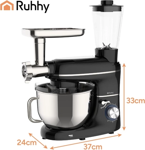 RUHHY 3w1 to wszechstronny pomocnik do nowoczesnej kuchni. W jednej stabilnej podstawie otrzymujesz planetarny robot do ciast i kremów, szklany blender do koktajli i zup oraz maszynkę do mięsa z trzema sitami do mielenia, nadziewek i domowych kiełbas. Wydajny silnik 1500 W z miedzianym uzwojeniem i metalowa przekładnia zapewniają niezawodną pracę nawet przy gęstych mieszankach.