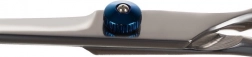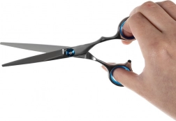 Niebieskie wkładki na palce, podpórki pod palce oraz gładki przegub z niebieską śrubą zapewniają wygodę, stabilność i precyzję nawet przy dłuższym strzyżeniu.