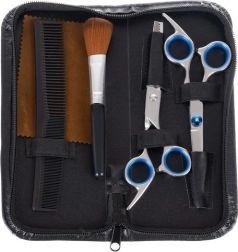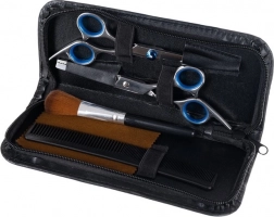 - nożyczki, nożyczki degażujące (27 zębów), grzebień, pędzelek, ściereczka czyszcząca, peleryna fryzjerska, etui