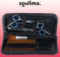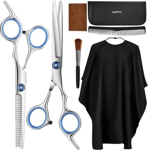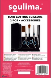 Kompletny zestaw fryzjerski do użytku domowego i profesjonalnego z 2 parami nożyczek (klasyczne i degażujące/efilujące), peleryną ochronną, grzebieniem, pędzelkiem oraz etui na zamek. Wysokiej jakości nożyczki ze stali nierdzewnej z ergonomicznymi podparciami palców i niebieskimi wkładkami zapewniają precyzyjne cięcie i wygodę. Wszystko przejrzyście ułożone dla bezpiecznego przechowywania i podróżowania.
