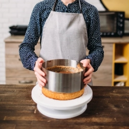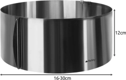 Uniwersalny, okrągły regulowany rant do tortu idealnie nadaje się do pieczenia biszkoptów, składania i chłodzenia tortów oraz deserów. Nie ma dna, więc ciasto wylewasz na blachę wyłożoną papierem do pieczenia i po prostu ustawiasz wymaganą średnicę. Wewnętrzna podziałka 16–30 cm co 2 cm oszczędza czas i zapewnia precyzję.