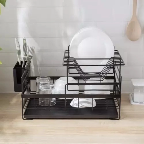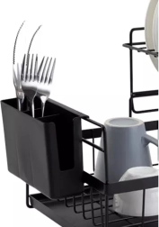 W zestawie znajduje się wyjmowany koszyk na sztućce z dwiema oddzielnymi przegrodami dla przejrzystej organizacji oraz łatwa w czyszczeniu tacka ociekowa, która zbiera wodę i utrzymuje blat kuchenny w suchości. Uniwersalna czarna kolorystyka i czyste linie w stylu loft doskonale wpasują się zarówno w nowoczesną, jak i klasyczną kuchnię.