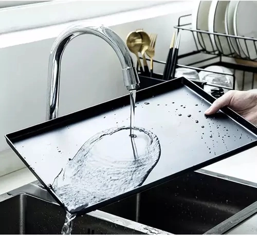 Gładka plastikowa tacka zbiera spływającą wodę i utrzymuje blat roboczy w suchości. Po użyciu wystarczy ją opłukać pod bieżącą wodą – pielęgnacja zajmuje chwilę.