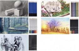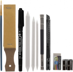 Ołówki grafitowe i węglowe do linii i cieniowania, akwarelowe i metaliczne kredki dla efektownego koloru, a do tego blendery, gumka, temperówka i inne akcesoria do precyzyjnej pracy.