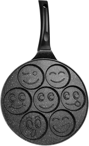 Urozmaicij śniadanie dla dzieci i dorosłych dzięki praktycznej patelni RUHHY na 7 naleśników lub jaj sadzonych jednocześnie. Dzięki powłoce nieprzywierającej, równomiernemu rozprowadzaniu ciepła oraz kompatybilności ze wszystkimi typami kuchenek, w tym indukcyjnymi przygotujesz zabawne placuszki ze smiley wzorami bez przypalania i z minimalną ilością oleju.