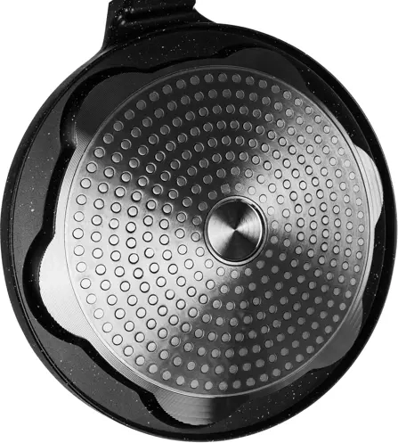 Patelnia wykonana jest z aluminium z grubym dnem dla dłuższego utrzymania ciepła i posiada nieprzywierającą powłokę PTFE/ceramiczną dla łatwego przewracania i czyszczenia. Ergonomiczny uchwyt (odpinany) ułatwia manipulację i przechowywanie. Odpowiednia do kuchenek gazowych, elektrycznych, halogenowych oraz indukcyjnych.