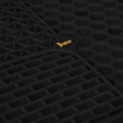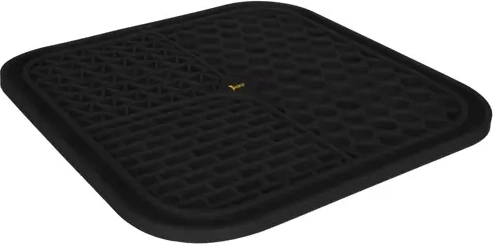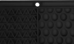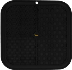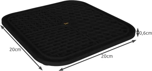 Mata jest antypoślizgowa dzięki mocnym przyssawkom na spodzie – trzyma się gładkich powierzchni (wanna, prysznic, płytki) i podłogi. Wypustki delikatnie masują dziąsła i pomagają ograniczyć resztki jedzenia w pysku, wspierając czystość i świeży oddech. Dzięki zróżnicowanym rowkom zwierzę stopniowo pozyskuje pokarm, co spowalnia łapczywe jedzenie i sprzyja lepszemu trawieniu.