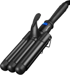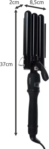 Ta potrójna lokówka o średnicy wałków 22 mm tworzy równomierne, naturalne fale w mgnieniu oka – wystarczy włożyć pasmo, ścisnąć i przesunąć. Ceramiczny element grzejny PTC zapewnia szybkie i równomierne nagrzewanie oraz delikatny kontakt z włóknem włosa bez zbędnego przegrzewania.