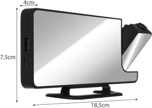 SPECYFIKACJA -materiał: ABS; kolor: czarny; kolor wyświetlacza projektora: czerwony; kolor wyświetlacza zegara: biały; format czasu: 12 h; podświetlenie: LED; nietłukące lusterko: tak; wymiary: 18,5 x 7,5 x 4 cm; waga: 0,144 kg; waga w opakowaniu: 0,238 kg.