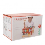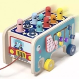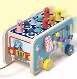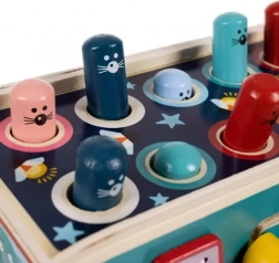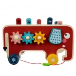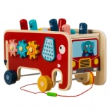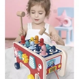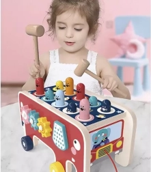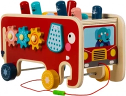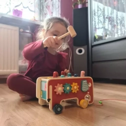 Ta zabawka wspiera rozwój małej motoryki i koncentracji dzięki interaktywnym elementom, takim jak młoteczki i koła zębate.