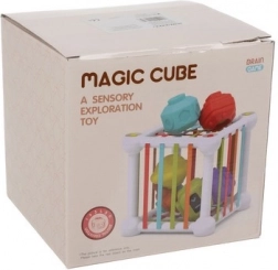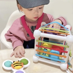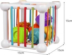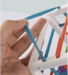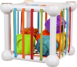 Ta edukacyjna zabawka łączy sortowanie kształtów, stymulację zmysłów i trening małej motoryki. Dzieci przeciągają elementy przez kolorowe gumowe paski, wkładają i wyjmują je, potrząsają nimi jak grzechotkami oraz odkrywają nowe faktury, kolory i kształty. Kostka jest lekka, wytrzymała i bezpieczna – wykonana z wysokiej jakości ABS bez BPA z zaokrąglonymi krawędziami.